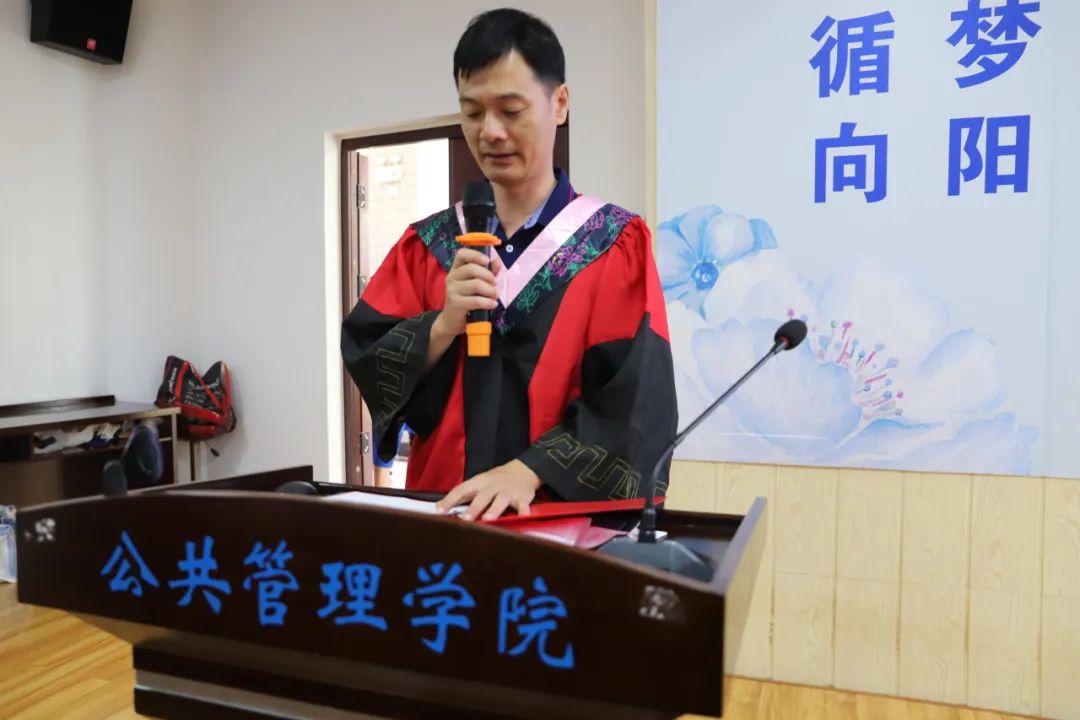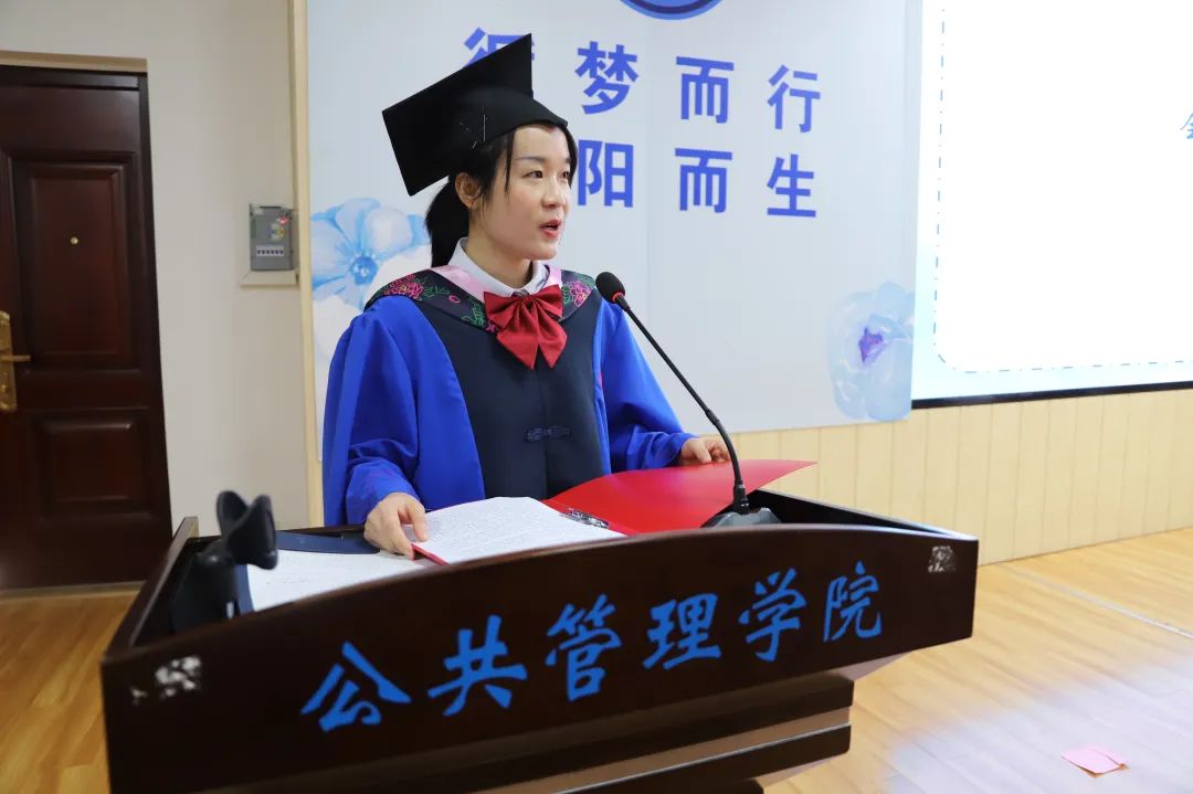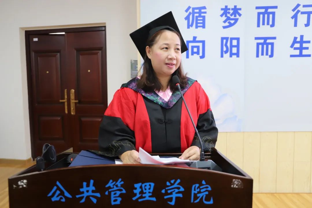 教师代表雷文艳向各位毕业生们表达了衷心祝贺,向在场的亲友团们表示崇高敬意和感谢,并嘱咐所有毕业生:“公共管理中的公共对应的是私人,我们采用公共手段的目的不只是维护公共,更是为了让私人生活变得更加美好。世界正经历百年未有之大变局,唯有通过学习才能把握主动、从容应对。”毕业只是人生的转场,终生学习的进程刚刚开始,只有持续充电才能跟上时代进步。道路且长,行则将至,无论身在何处,老师们都会和你们一起学习、成长!