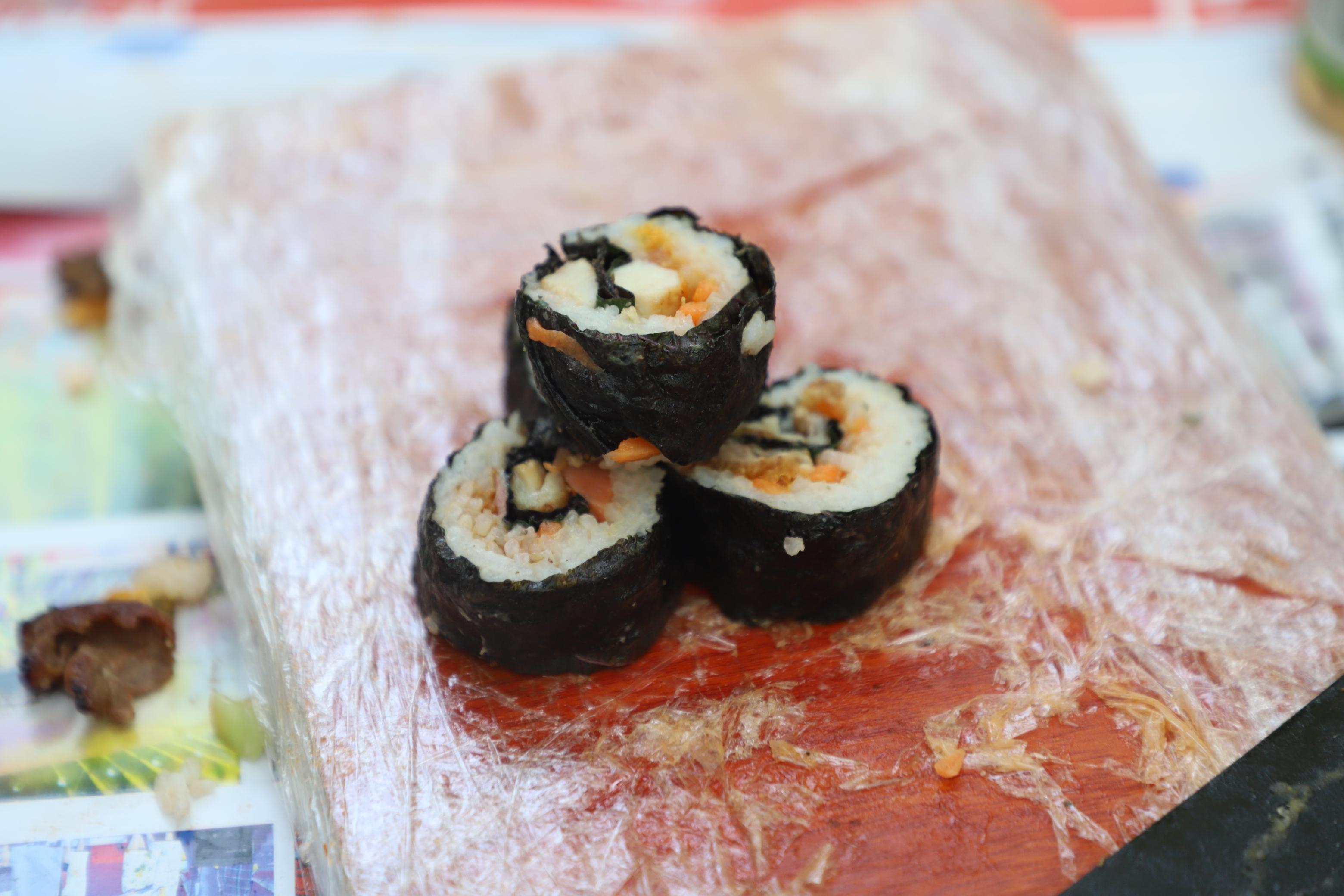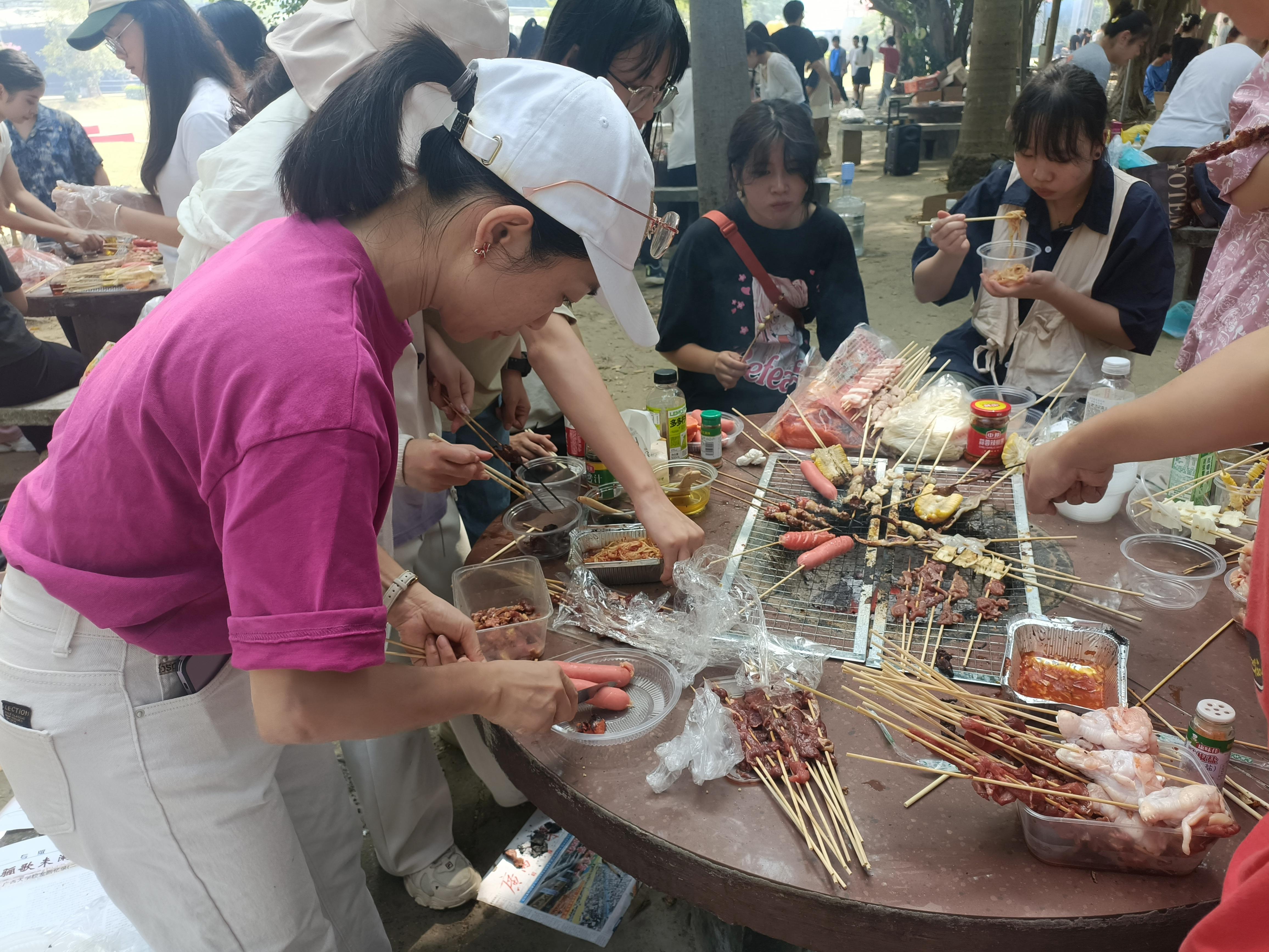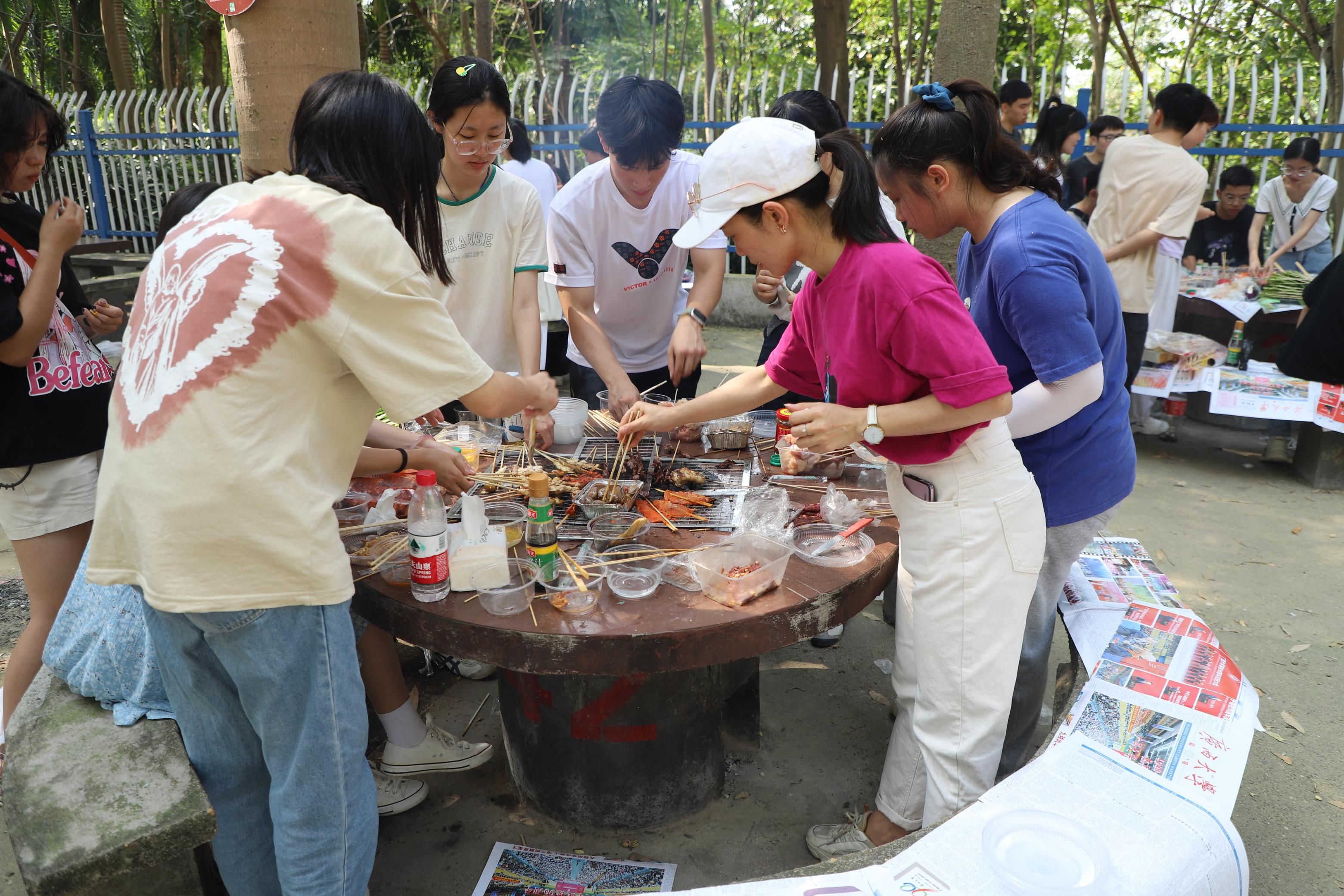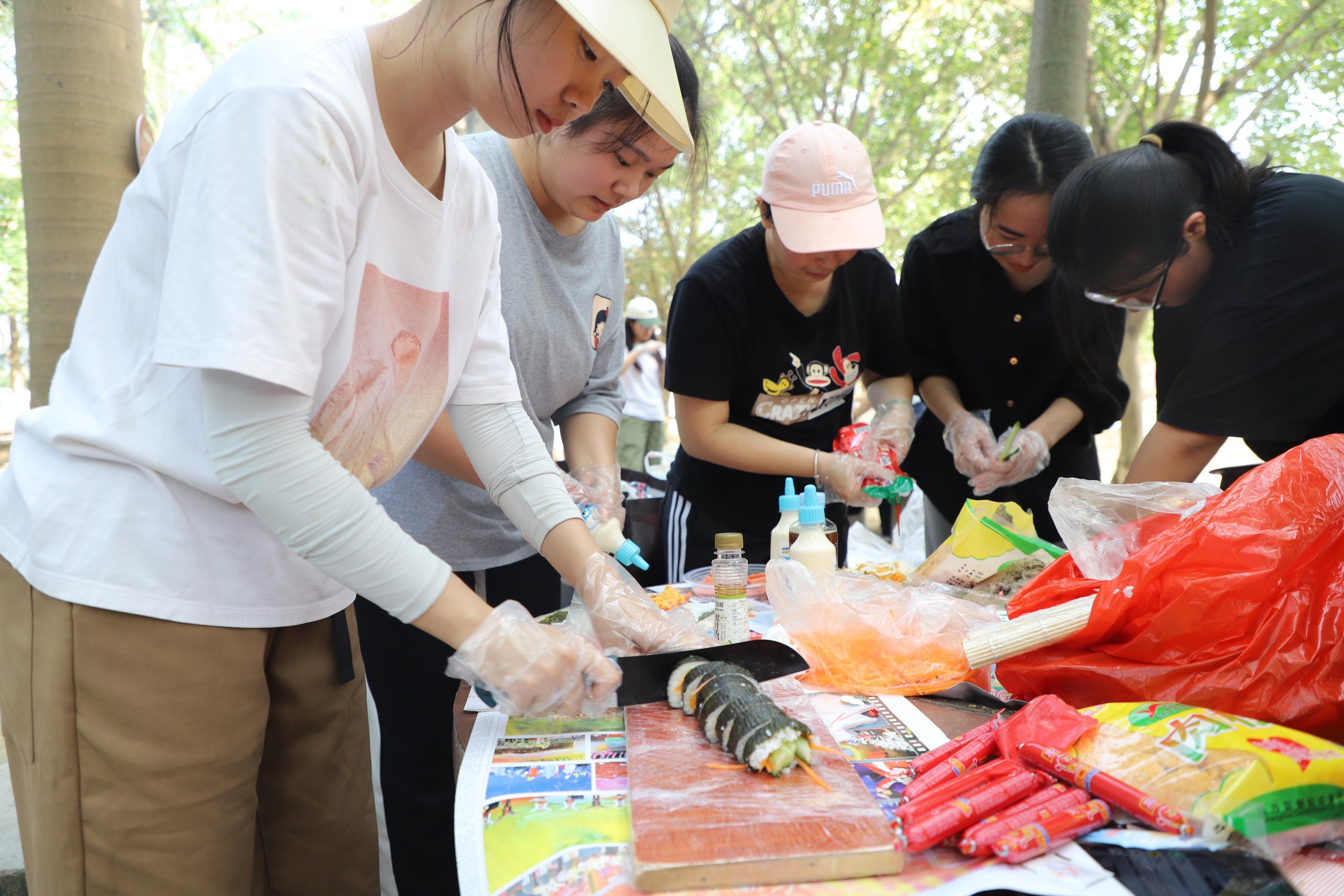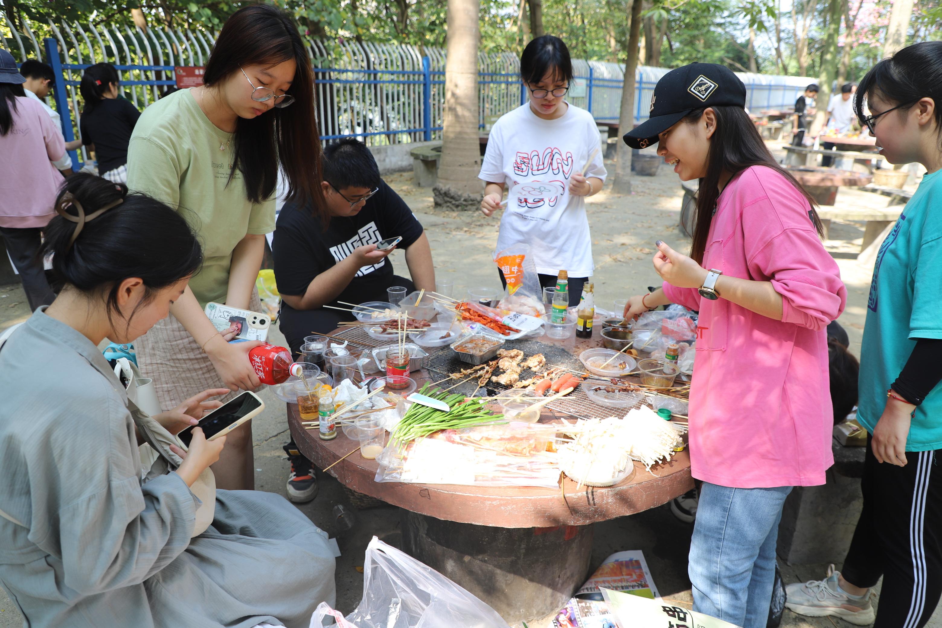 打水、洗菜、串肉、烧烤,同学们忙的不亦乐乎……老师们也加入了这场户外盛宴,庞惠老师亲手给大家烤制了美味的香肠,黄文静老师带领团委学生会干部一起卷寿司,刘佩瑶老师帮助大家处理食材,侯俊丽老师与同学们亲切交谈关心大家的学习生活。在老师的帮助与大家的努力下,同学们最终都吃到了自己精心烤制的食物,更是体会到互帮互助、团队合作的重要性。