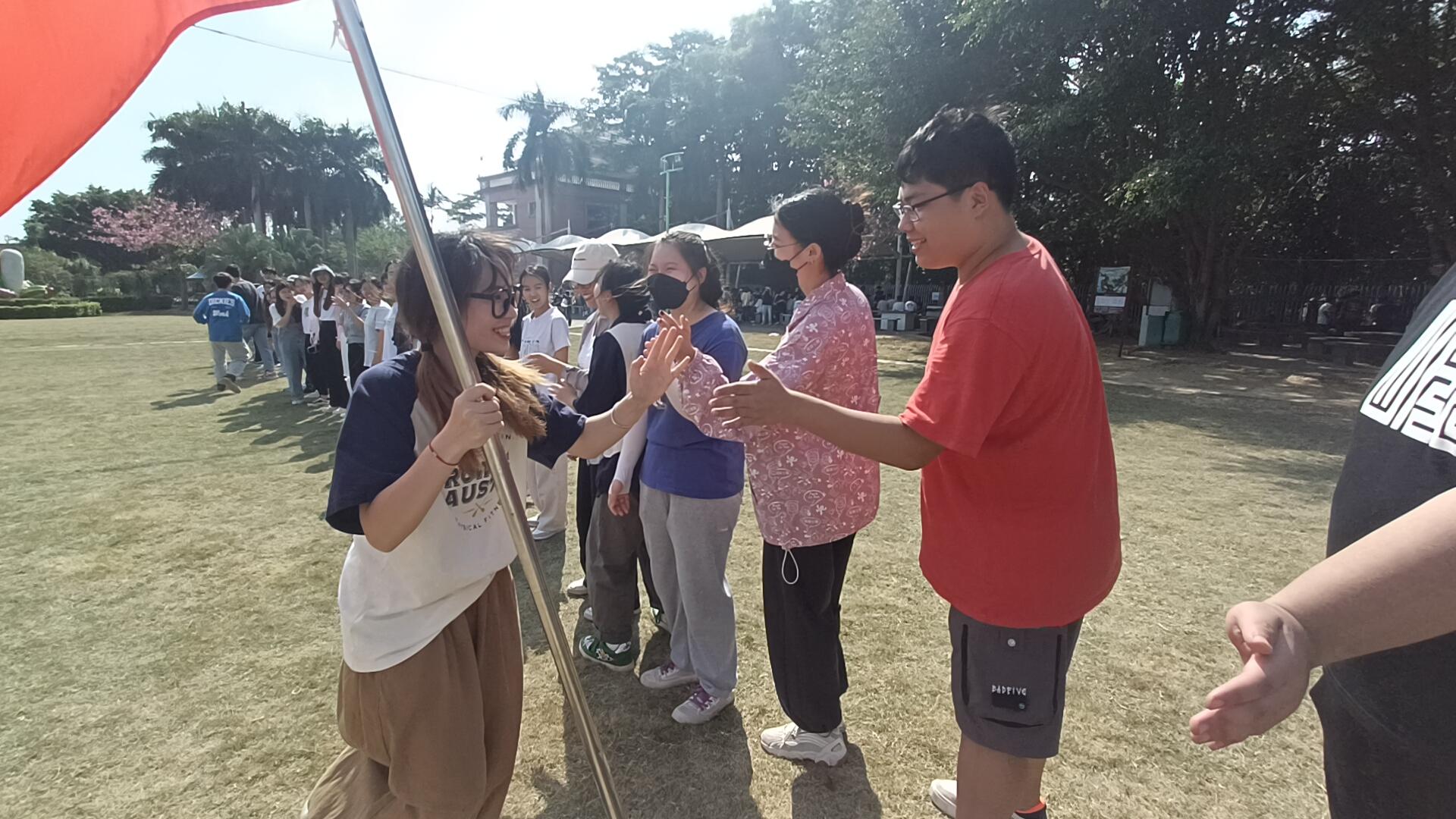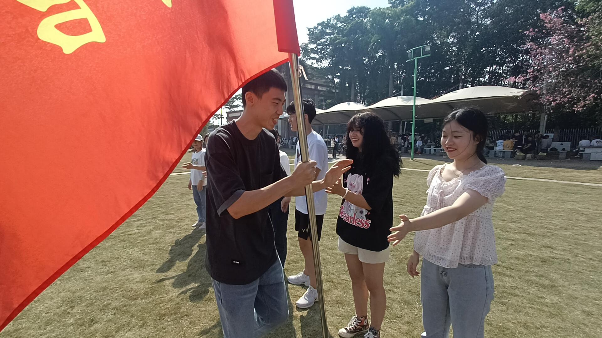 新老干部在奔跑中击掌传旗,奔跑是奋进,击掌是鼓励,红色院旗手手相传,象征着使命的凝聚与责任的传承。最后,老师和干部共同挥舞院旗,寓意着师生协力共同书写公管新篇章!在明媚阳光下,庄严的红色旗帜随风飘扬,也激励着新任干部再接再厉、砥砺前行!