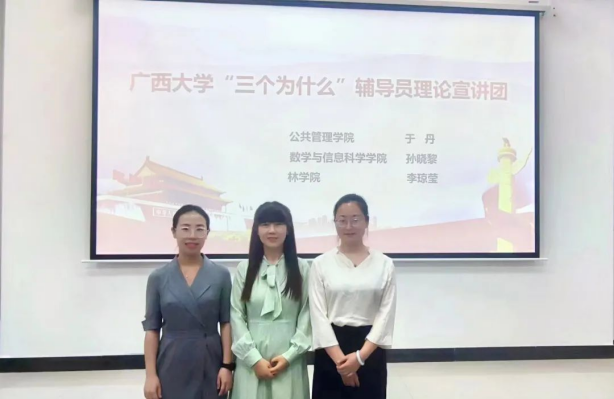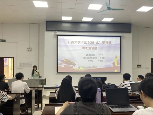 为深入学习贯彻习近平新时代中国特色社会主义思想,深刻了解中国共产党、中国特色社会主义、马克思主义三者“能、好、行”的辩证关系,广西大学"三个为什么“辅导员理论宣讲团于6月4日下午15时于学院101教室开展理论教学,MissAVt 党委副书记于丹,数学与信息科学学院孙晓黎与林学院李琼莹进行授课。