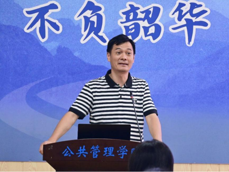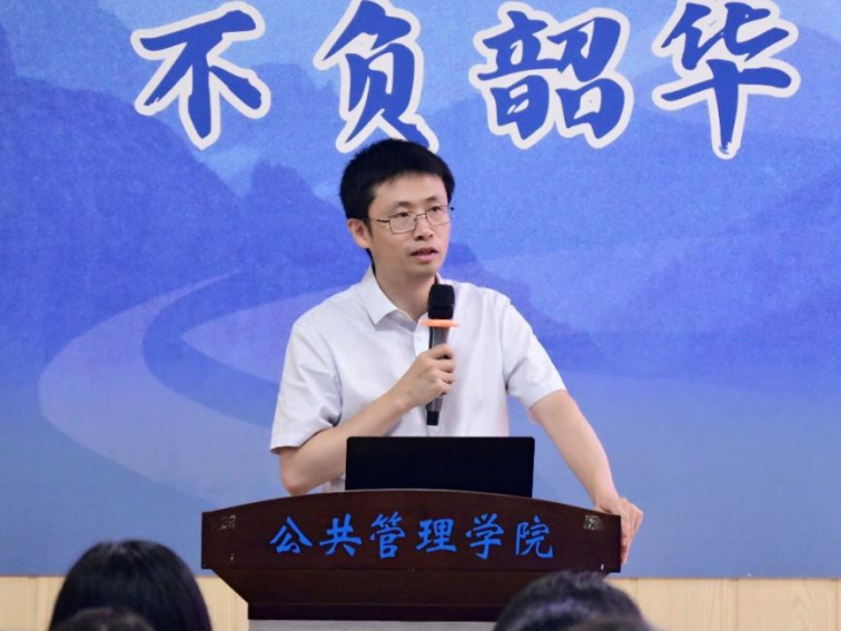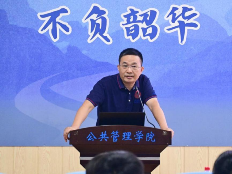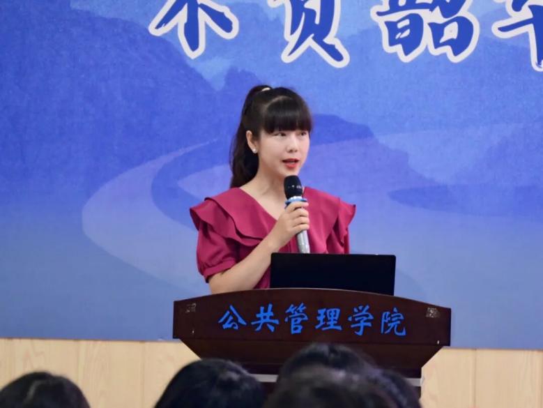 随后,2025级新生代表杨馨闻发言,讲述了自己的工作经历、考研感悟和读研规划。她表示,在作为选调生参与驻村工作的过程中,她逐渐发现自己在公共管理领域的理论储备跟不上服务群众的实践需求,从此下定了考取公共管理研究生的决心;以此鼓励同学们不忘初心,坚持把理论知识运用到服务人民的工作实践中。在读研规划上,她勉励自己和同学们要多读公共管理专著和论文,多参与调研项目和学科竞赛,锻炼知识运用技能;多关注政策文件,多去走访调研了解民生需求,为基层治理优化、服务民生福祉贡献自己的力量。