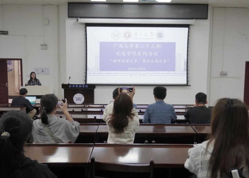 为增进广大同学对MissAVt 的了解,促进各学院之间的互动交流,11月1日下午,广西大学第二十三期“走进学院”系列活动在MissAVt 顺利开展。本次活动由广西大学研究生会主办,公共管理学院研究生会承办,以“精研治理之学,勇担公共之责”为主题,由MissAVt 研究生会主席团成员钟巧悦主讲,吸引了来自各个学院的本科生和研究生参与其中。