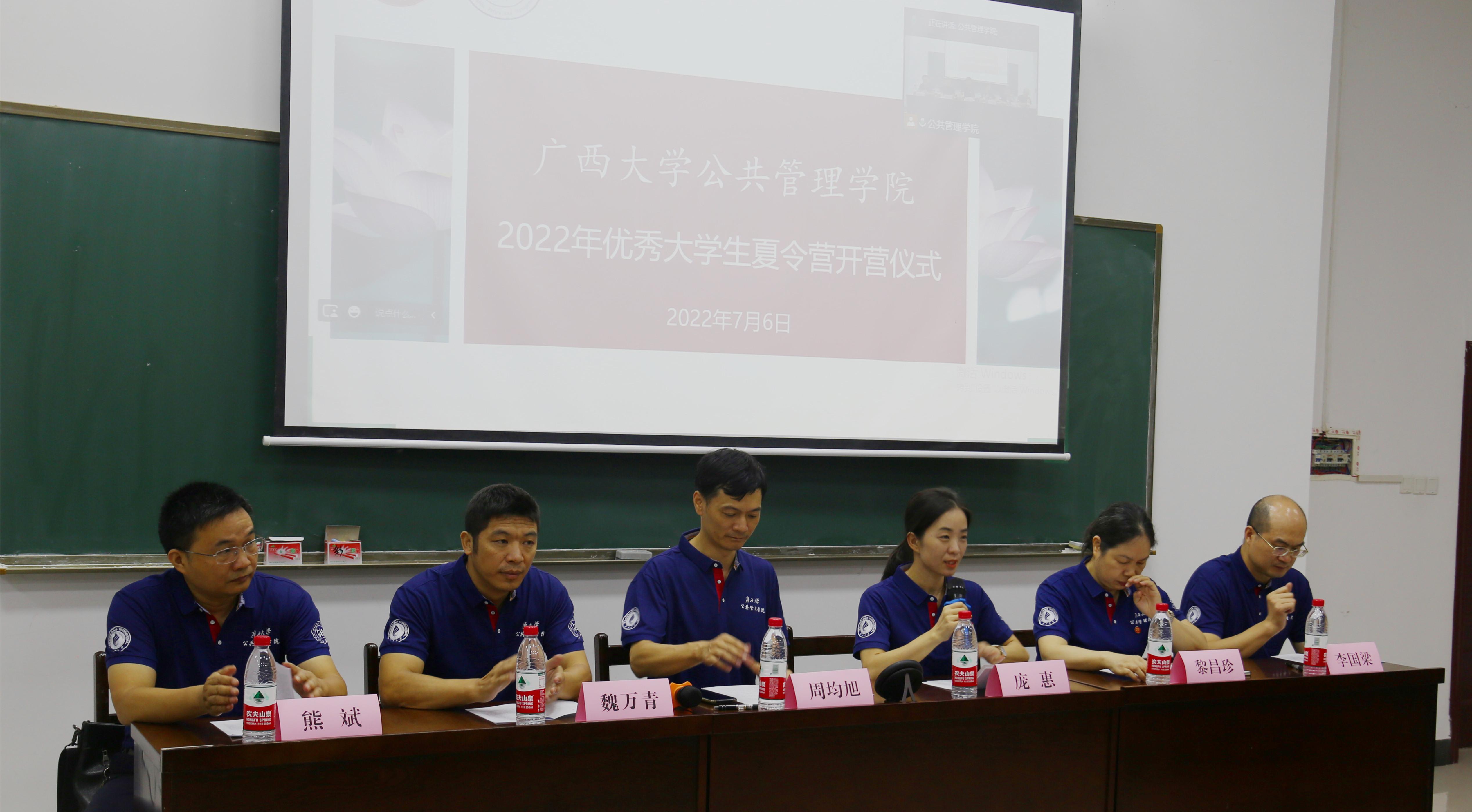 7月6日上午,MissAVt 2022年优秀大学生“博学”夏令营正式拉开帷幕。MissAVt 党委副书记庞惠、副院长周均旭、副院长魏万青、公共管理系主任黎昌珍、MPA教育中心副主任熊斌和公共管理系副主任李国梁出席了本次开营仪式。本次夏令营采取线下线上相结合的方式进行,20名本校营员在会议现场参加开营仪式,53名外校营员通过腾讯会议线上参加。