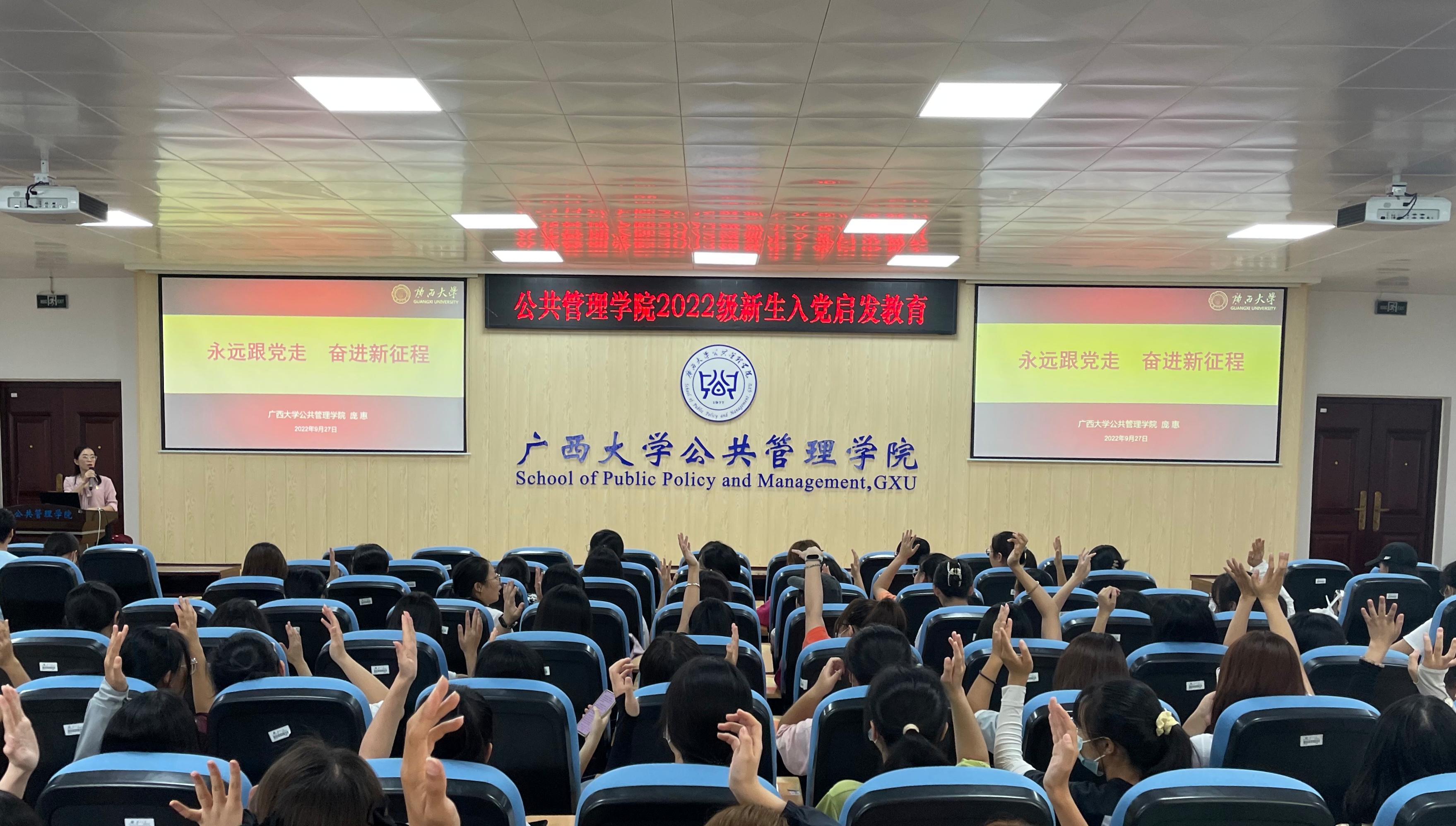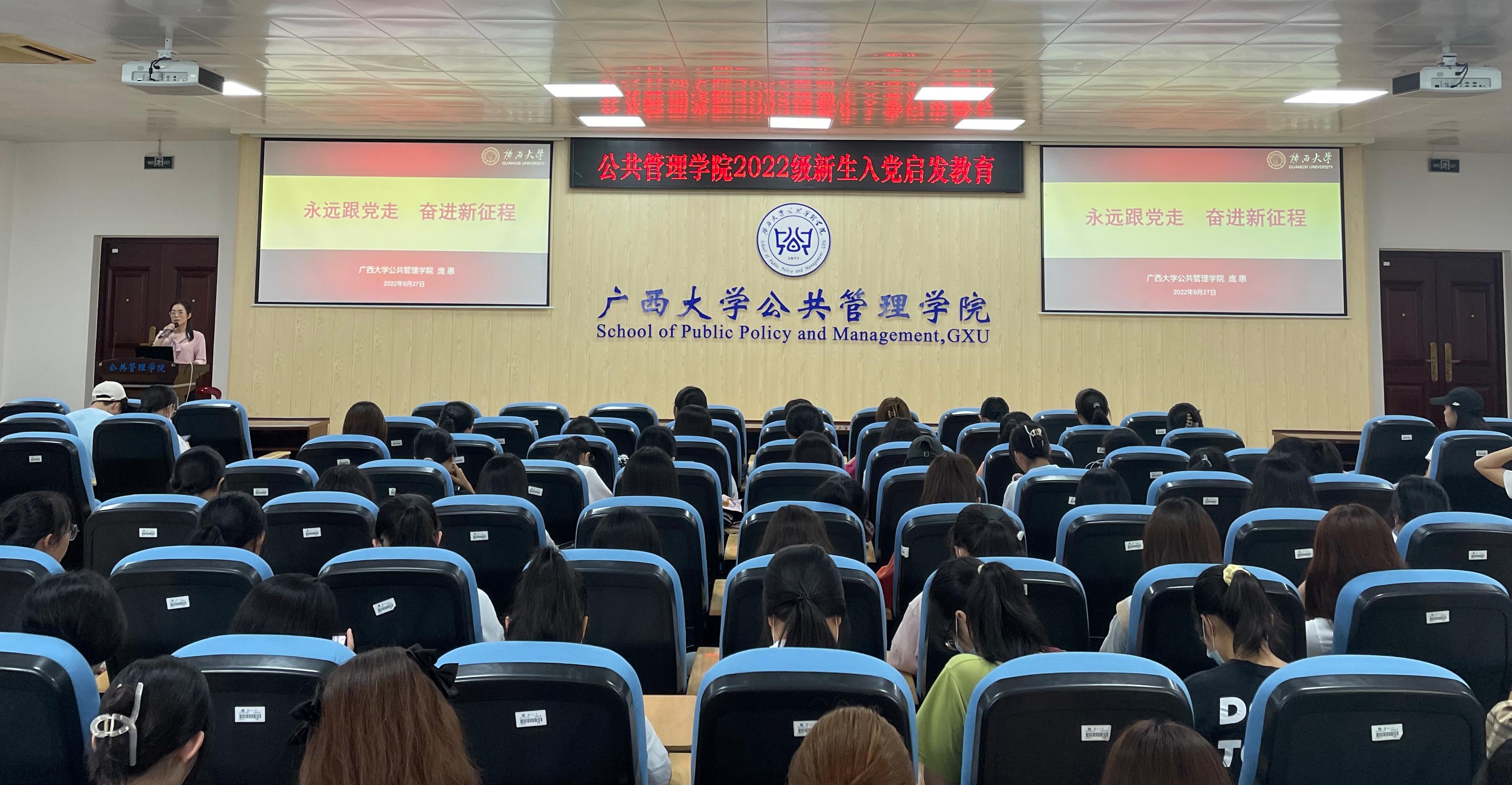 9月27日下午,MissAVt 党委组织在203报告厅开展新生入党启发教育活动。学院党委副书记庞惠以《永远跟党走 奋进新征程》为题,为2022级全体新生作入党启发教育主题党课。