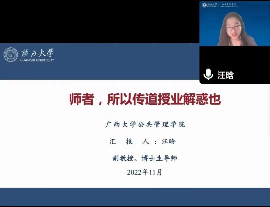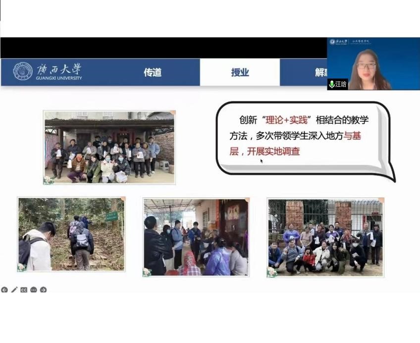 汪老师连续三年荣获广西大学“我心目中的好老师”称号,是一位深受广大学子喜爱的优秀教师。在报告会中,她主要从传道、授业和解惑这三个方面展开分享。