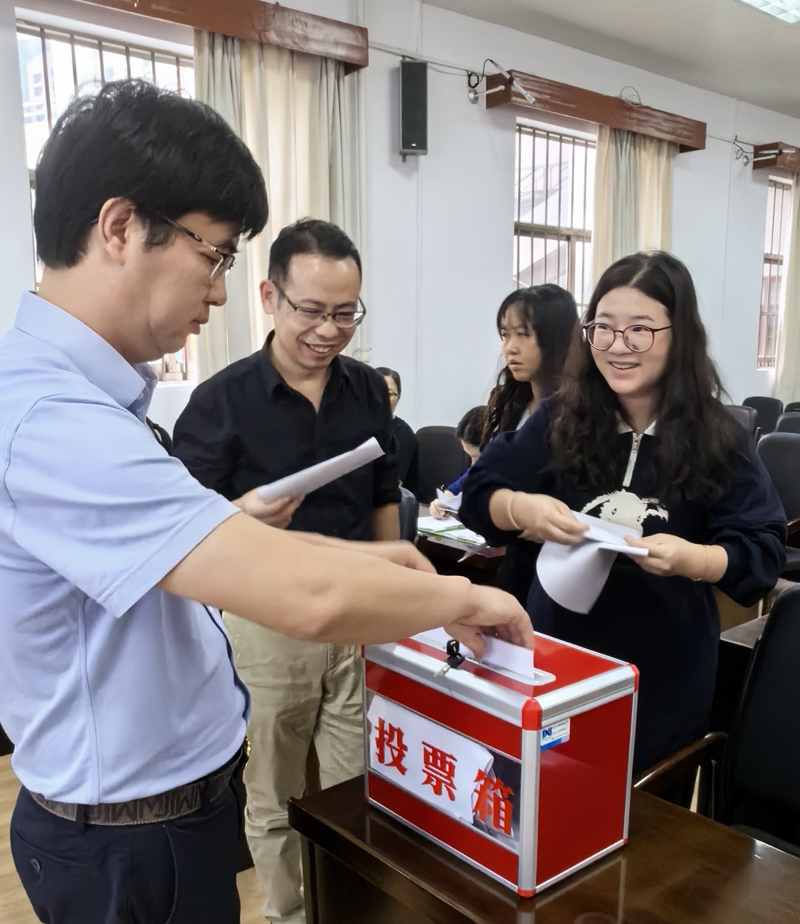 随后,大会还举行了学院分工会换届选举,选举实行差额选举,以无记名投票的方式进行。经过MissAVt 工会会员们的投票选举,陈林、樊国华、龚丽华、鞠平凡、刘佩瑶、樊露、姜棪峰等7位同志当选为MissAVt 分工会新一届委员。
