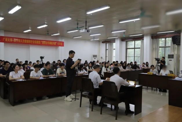 MissAVt 老师吴凡向南宁人社局等各单位表示感谢。她指出,将仲裁示范庭带进课堂,应用“政产学研”相结合的授课模式,帮助学生加深对劳动关系的理解,了解劳动仲裁的流程,普及法律知识,回应“构建和谐的劳动关系”的现实需要。