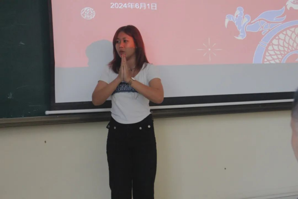 本次交流会得到了广西大学国际学院的大力支持,特别选派了优秀的留学生代表。印度尼西亚的留学生温初花(20级·汉语国际教育研究生)、黄平妹(19级·汉语国际教育研究生)、吴佳宜(19级·汉语言文学本科生)、谢源香(23级·汉语语言班)分享了印尼人的社交礼仪习惯,如如何穿着得体、如何礼貌地交流等;来自老挝的戚谭伟(20级·国际贸易专业本科生)留学生分享了他们国家的传统祝福礼仪“拴线礼”的细节,并解释这个礼仪背后的文化含义,让大家感受到了老挝人民的热情与友好。泰国留学生详细讲解了泰国“合十礼”的正确做法和注意事项;越南留学生明慧(21级·汉语言文学本科生)、阮氏玉映(21级·汉语言文学本科生)则向大家展示了越南的传统服饰“奥黛”,让在场的师生感受到了越南文化的魅力。