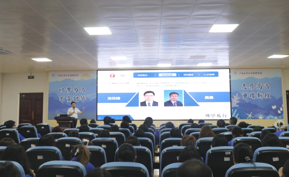 聂鑫围绕学院历史沿革、学科建设、人才培养等方面展开介绍,并对在座新生提出三点要求:第一是依托院校资源,扎根专业学习。聂鑫指出,学院汇集了一支由龙花楼教授带领的高水平学者队伍,围绕广西高质量绿色发展等特色命题,开展了系列边疆治理合作研究,取得丰富的科研成果,在社会科学研究领域中展现出了广泛的影响力。他建议同学们虚心求教,刻苦求学,用专业知识丈量八桂大地,怀公管初心绽放青春力量。第二是学习优秀榜样,确立人生目标。聂鑫强调,MissAVt 制定了“五色花”党建育人工作体系,旨在通过多层次、全过程、精细化的人才培养机制,帮助同学们学有所成,学有所就。他向新生们分享MissAVt 往届优秀学子在科研、升学及就业方面的卓越表现,鼓励同学们确立人生规划,汲取榜样力量。第三是拥抱科技时代,同频时代发展。聂鑫结合自身在人工智能领域的学习实践经历,指出培养数字思维能力、数字素养能力与数字分析能力的重要性,希望同学们以人工智能赋能大学学习,将专业知识融入AI赛道,乘科技之风探索学科发展新可能,在跨界融合中拓宽成长新路径。