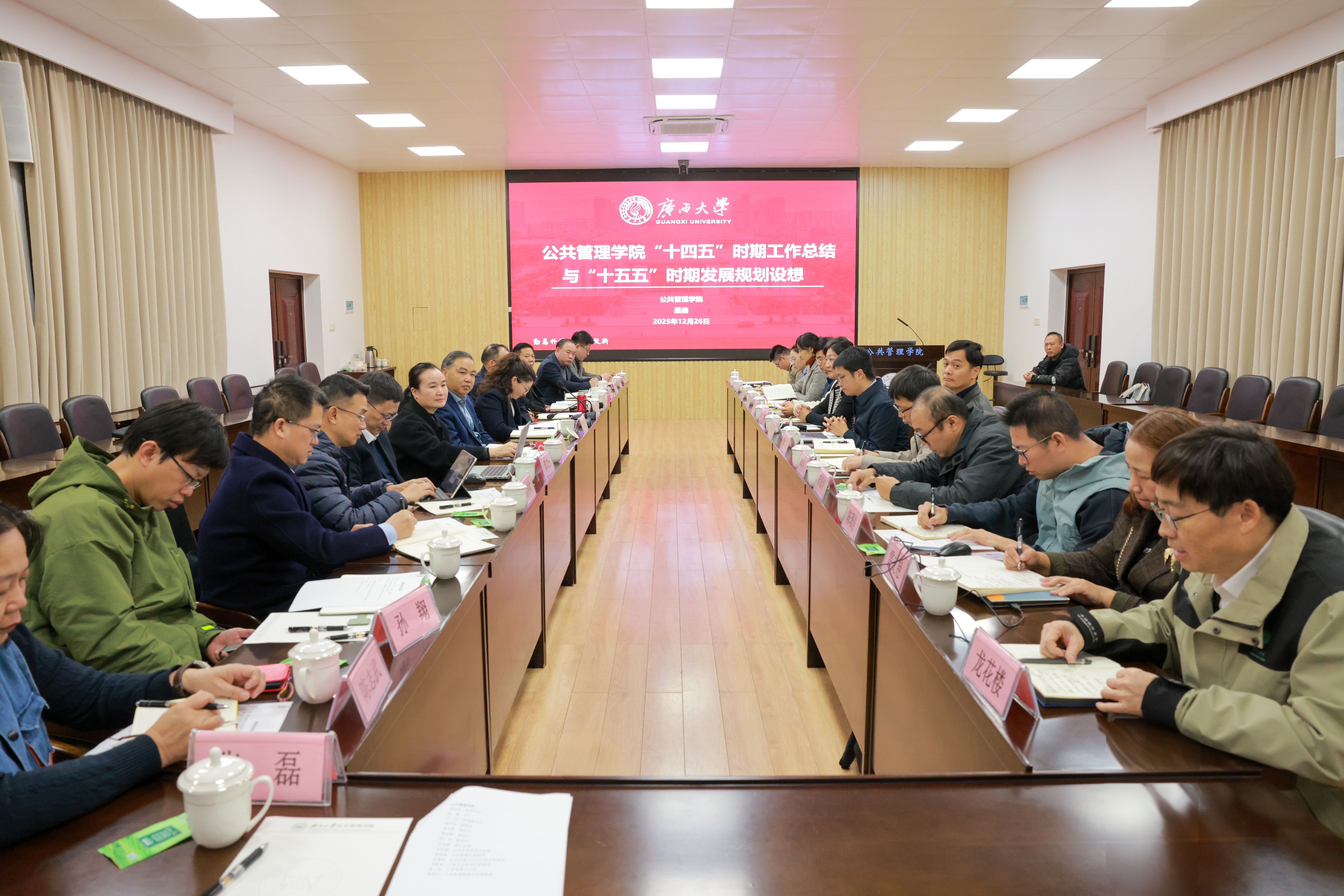 会上,聂鑫从“十四五”发展成效、现存短板不足、“十五五”规划思路三个维度进行了汇报,他表示学院将紧扣国家战略与广西“三大定位”要求,聚焦绿色发展与边疆治理、中国-东盟公共治理(AI)、乡村振兴与非政府组织三大特色方向,重点推进五大规划落地实施。与会职能部门负责人逐一回应学院提出的请求,现场协调对接解决方案,为学院发展纾困解难。
