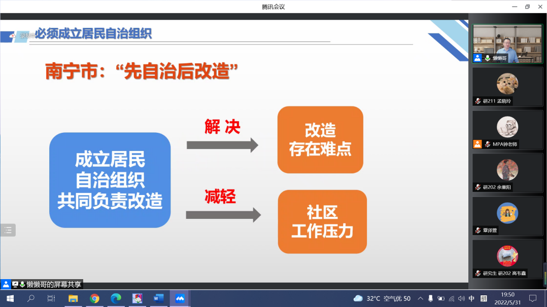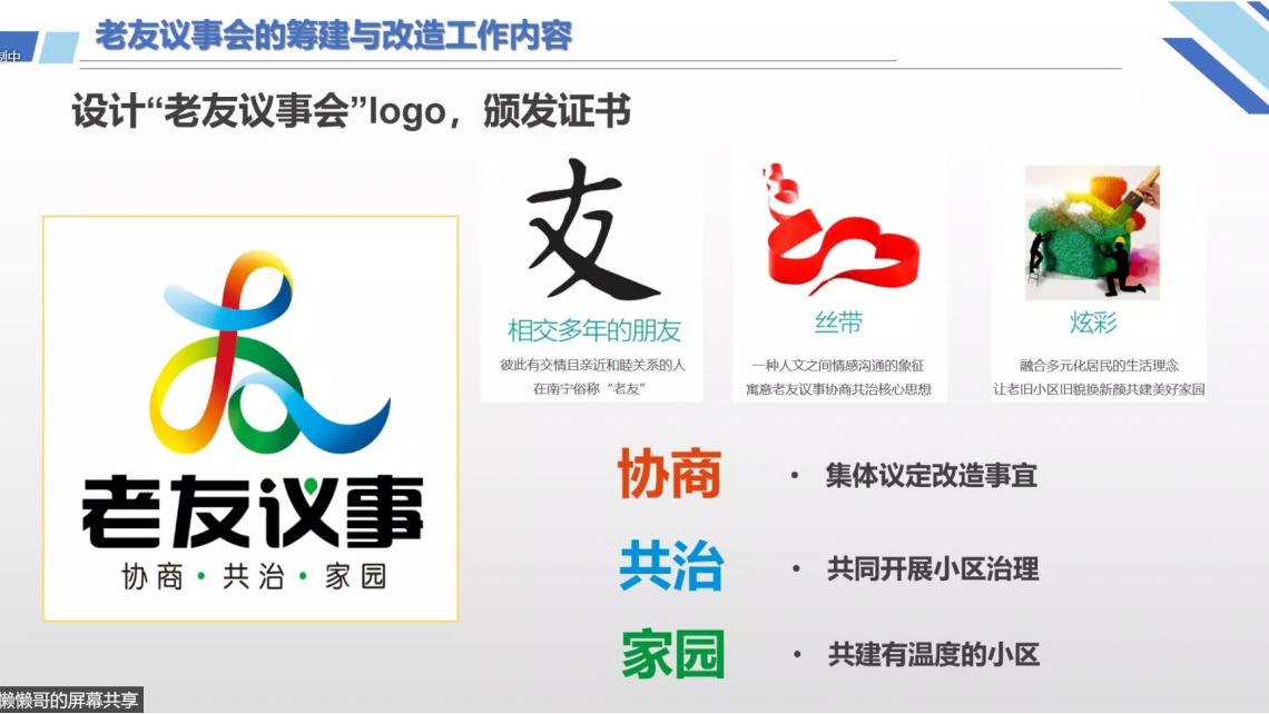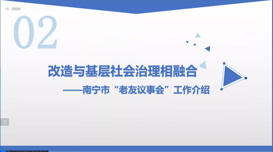 韦戈书记通过logo、制度设计、主要工作内容、筹建流程、议事规则等方面对南宁市“老友议事会”进行了详细介绍。他指出,如今老旧小区改造由政府统筹协调,老友议事会的代表直接与各方主体沟通。这种形式可以厘清各方责任,同时把问题消灭在萌芽阶段。城市更新的工作制度结构由政府大包大揽的管理模式转型成政府负责、社会协同、公众参与的治理模式,体现了“共同缔造”的原则,实现了“改不改、改什么、怎么改”由小区居民说了算,增强了居民的获得感、幸福感、安全感,对小区业主委员会的成立有正向作用。