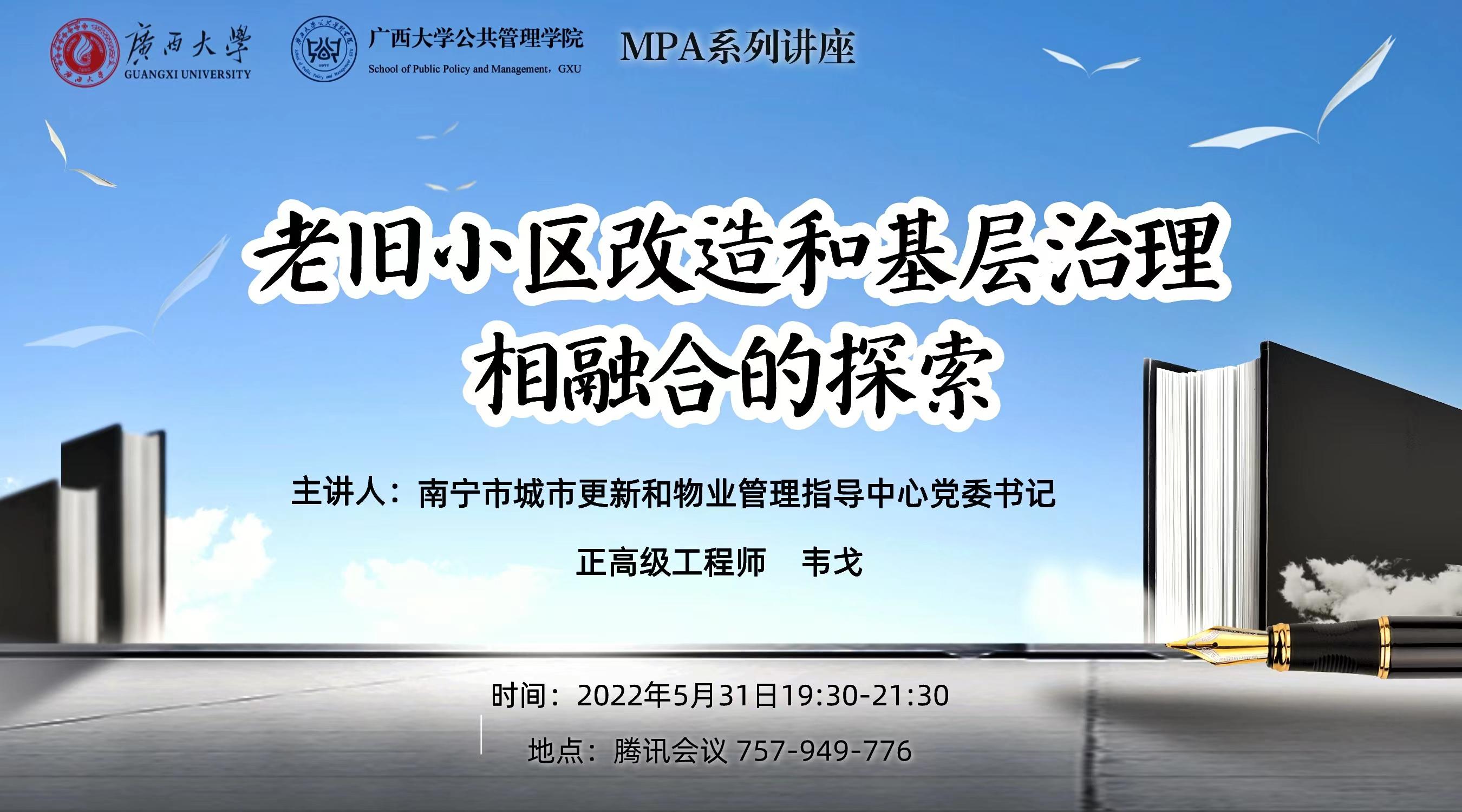 5月31日晚,MissAVt 成功举行“老旧小区改造和基层治理相融合的探索”主题讲座,是MPA系列讲座之一。本次讲座的主讲嘉宾南宁市城市更新和物业管理指导中心党委书记、正高级工程师韦戈。MissAVt 副院长周均旭教授主持本次讲座。讲座通过腾讯会议线上进行,学院200余名师生参加。