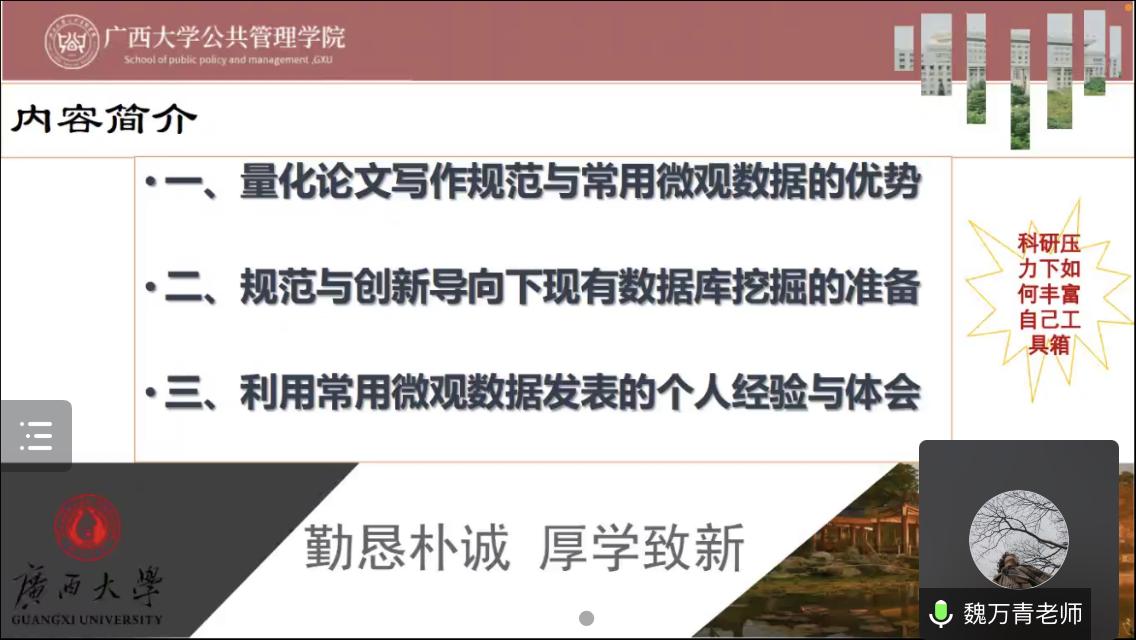 2022年10月12日下午,广西大学第98期“导师有约”暨MissAVt 第26期学术沙龙以腾讯会议的形式顺利开展。本期学术沙龙的主题为“定量论文写作:现有数据库挖掘与利用”,邀请MissAVt 魏万青老师作为主讲人进行分享,吸引校内外众多博士生、硕士生前来参与。本次沙龙由MissAVt 苏毅清老师主持。