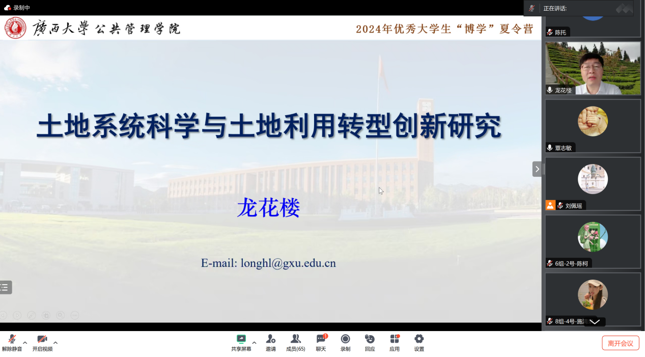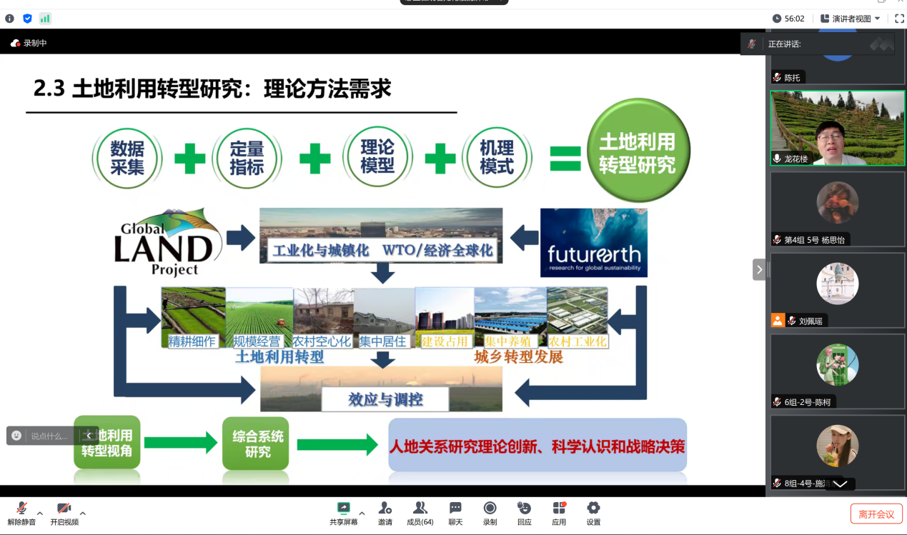 7月10日上午,MissAVt 教授龙花楼老师以线上形式作主题为“土地系统科学与土地利用转型创新研究”的学术讲座。本次讲座是MissAVt 2024年“博学”优秀大学生夏令营的环节之一,由MissAVt 副院长覃志敏主持,六十余名“博学”夏令营营员参与其中。