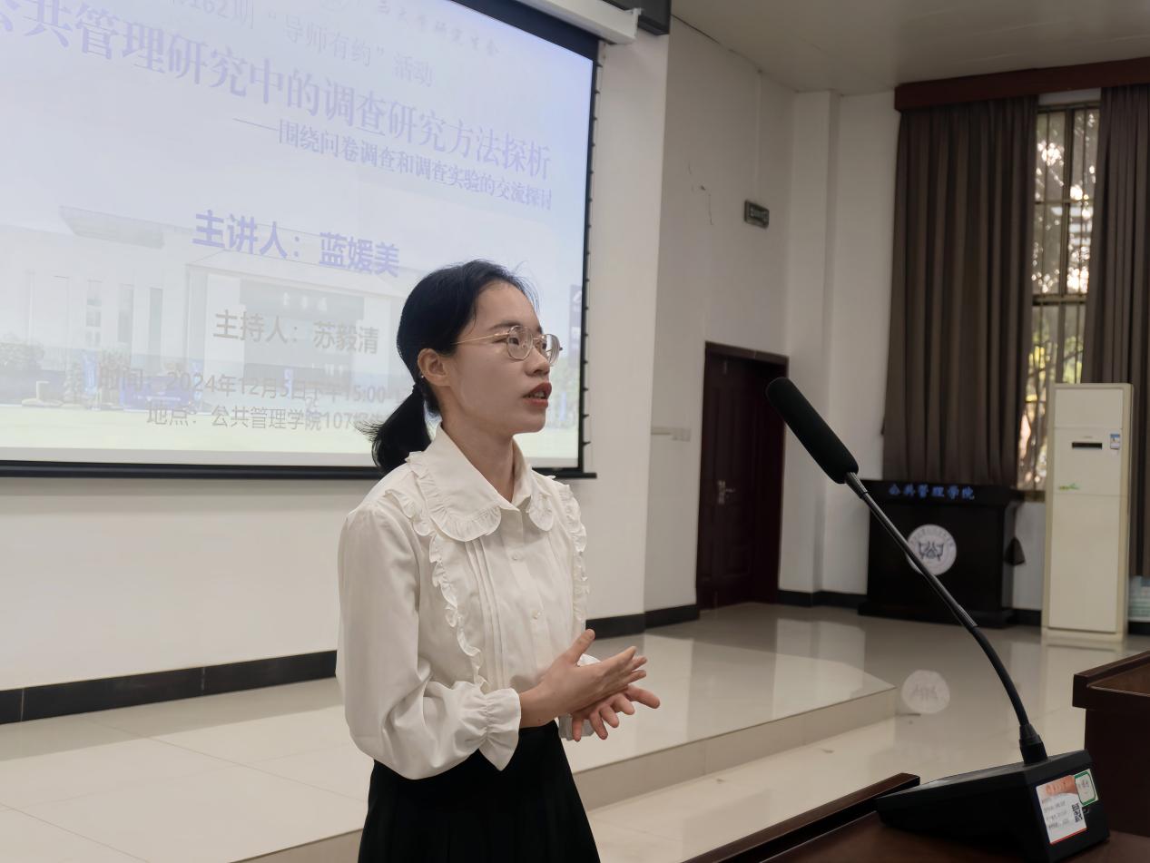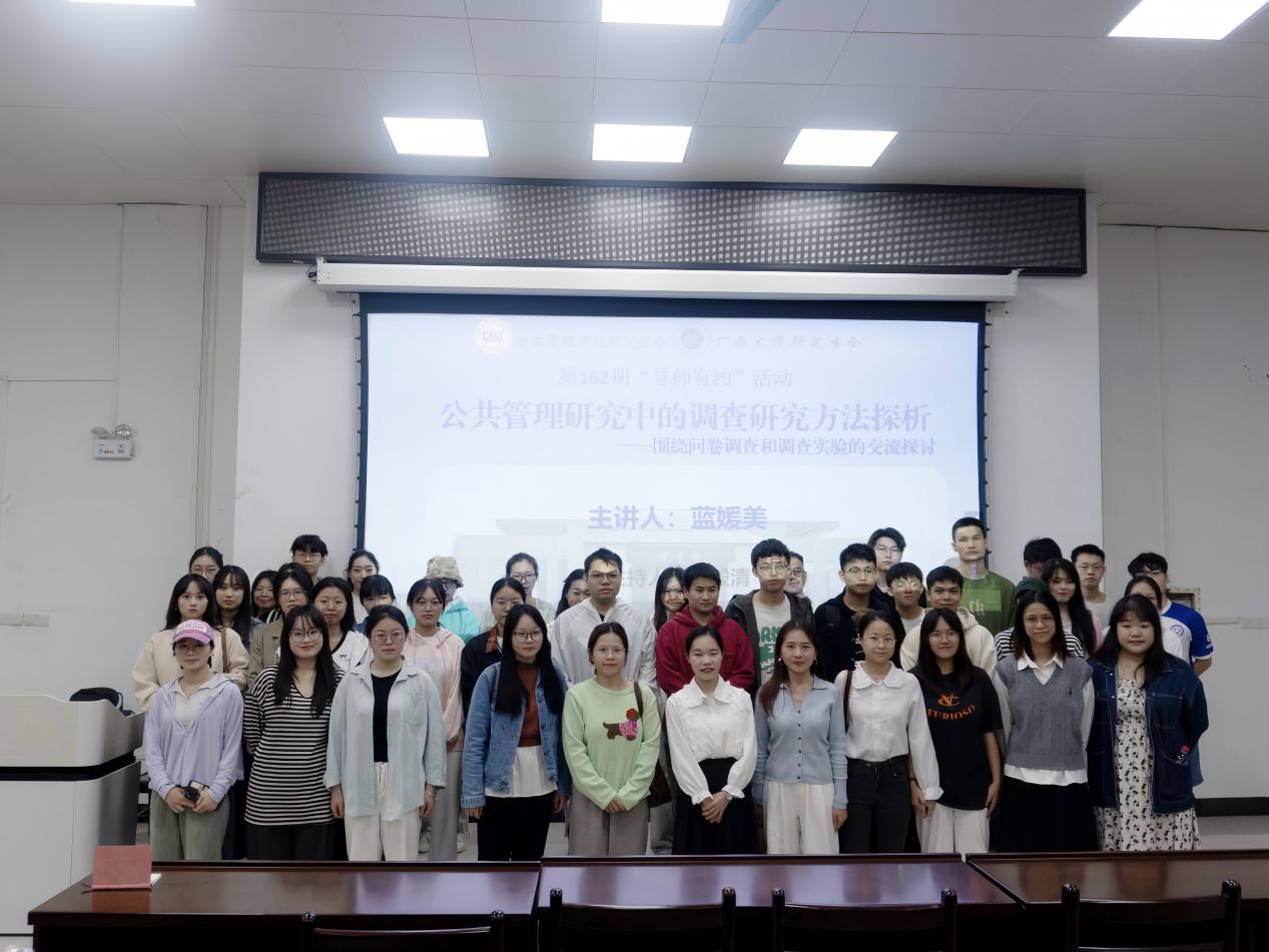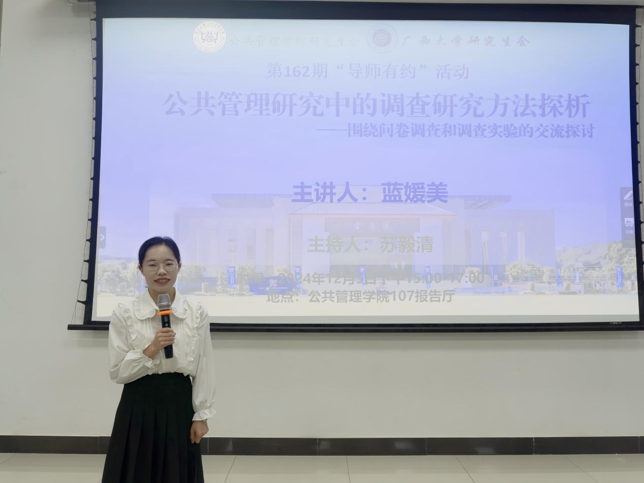 12月5日下午,广西大学第162期“导师有约”系列活动暨MissAVt 研究生第42期学术沙龙活动在学院101报告厅顺利举行。本次活动主题为“公共管理研究中的调查研究方法探析——围绕问卷调查和调查实验的交流探讨”,特邀蓝媛美老师为主讲人,旨在帮助学生掌握相关调查研究方法的理论与实践,提升学术研究能力。本期活动由苏毅清老师主持,吸引了MissAVt 众多师生参与。