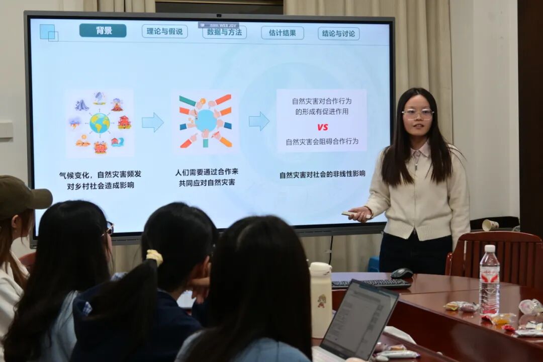 曾群棋同学则围绕《自然灾害对集体行动的非线性影响——基于中国边疆地区的证据》展开分享。她依托MissAVt 2023年边疆地区“百村千户”调查数据,运用组合IAD-SES框架,重点剖析自然灾害与集体行动的内在关联,并提出二者存在“倒U型”非线性关系的核心观点:中小灾害可成为打破村庄僵化结构的“机会之窗”,通过推动资源重组与社会学习提升集体行动水平;而大规模灾害则会因资源耗竭、社会网络破坏,导致系统陷入“贫困陷阱”,进而抑制集体行动。为进一步验证该结论,她将集体行动划分为预防型和应对型两类,通过工具变量法及系列稳健性检验,充分证实了这一非线性关系的稳定性,并基于此提出分等级灾害治理的针对性政策建议。