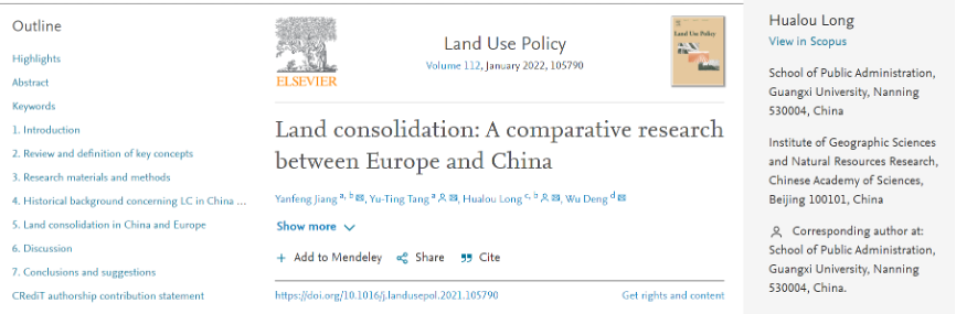 该论文题为《Land consolidation: A comparative research between Europe and China》,发表在土地科学领域权威期刊《Land Use Policy(JCR 1区,IF 2021=6.189;中科院分区:法学1Top)。本文是第一次尝试对整个欧洲和中国的土地整治进行系统的对比研究,为土地整治的相关研究和发展提供了一个更广泛的视角,并在此基础上为进一步推动欧洲地区和中国土地整治的发展提出了策略与建议。