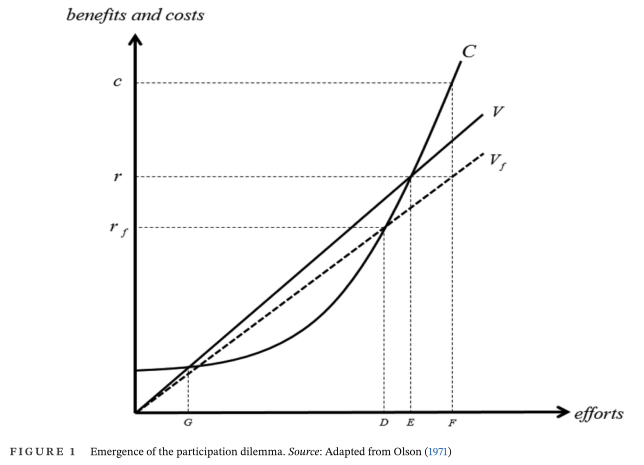 Olson(1971)指出,当参与者需要共享结果时,每个参与者得到的个人利益相对于参与成本而言很小。论文用图1解释消费者在参与食品安全治理时面临的困境,以及为什么以降低成本为导向的政策在存在参与困境(即集体行动困境)的情况下无法成功。即当消费者意识到即使他们不参与到食品安全治理(有其他人参与的话)也能同样获益,那么“搭便车”的情况就出现了。这种情况下,集体物品的收益曲线由V转变为Vf,获益均衡点也由r降低至rf。那么,消费者为了获得原有的收益点r,须付出更多的努力(F点),显然F点对应的成本c远高于收益r,理性的消费者不会参与其中。