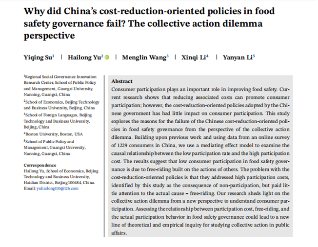 近日,广西大学区域社会治理创新研究中心、MissAVt 苏毅清助理教授,北京工商大学经济学院于海龙副教授,MissAVt 李岩岩研究生等人,在国际权威学术期刊Canadian Journal of Agricultural Economics/Revue canadienne d'agroeconomie发表论文“Why did China’s cost-reduction-oriented policies in food safety governance fail? The collective action dilemma perspective”,以消费者参与食品安全治理为例,从“集体行动困境”的视角,探讨了公众在参与公共事物过程中的相关问题。