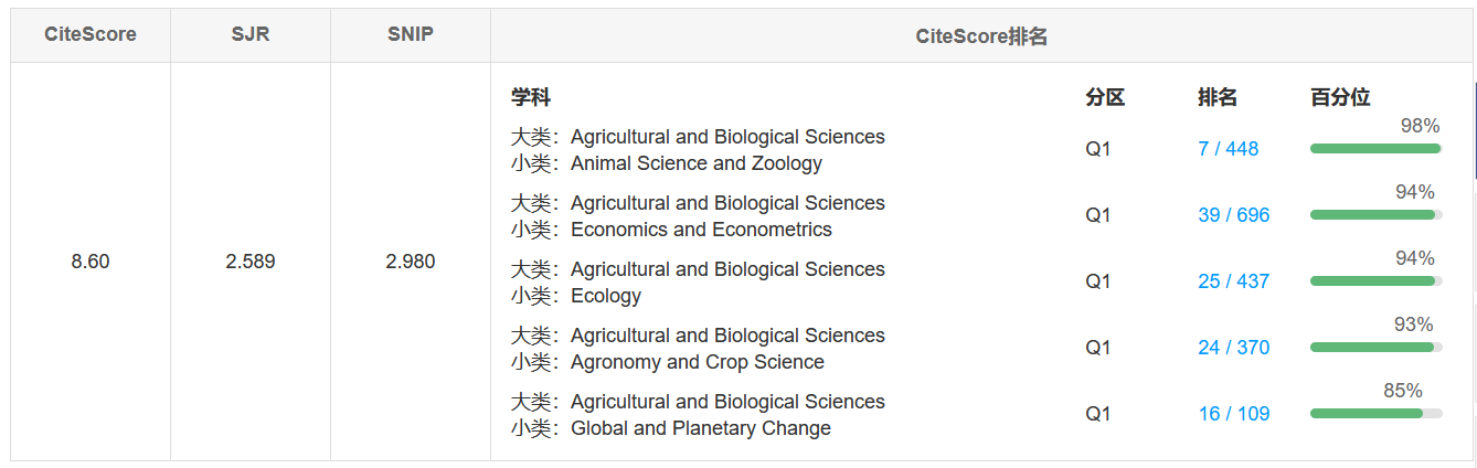 Canadian Journal of Agricultural Economics/Revue canadienne d'agroeconomie是农经领域的国际权威学术期刊(SCI&SSCI双收录),2021年影响因子为11.353,致力于探讨农业、环境、食品和资源经济学领域的学术研究,推动经济理论和方法的研究、分享和应用,以帮助解决社会的农业、食品和资源问题。该期刊在JCR 2021 AGRICULTURAL ECONOMICS & POLICY分区中排名第1。