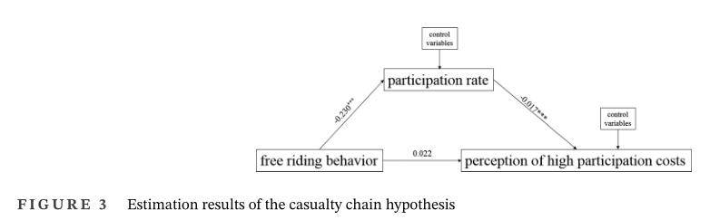 实证研究利用1229名中国消费者的在线调查数据,使用中介效应模型来检验引发集体行动困境的搭便车行为与公众对食品安全治理的参与率之间的因果关系。结果发现:消费者在食品安全治理中的低参与率是他人对同样的问题进行搭便车的结果。由此,以降低成本为导向的政策存在的问题是,这些政策虽然解决了高参与成本的问题,但却忽视了一个被很少关注的前置原因——广泛存在的搭便车行为(图3)。