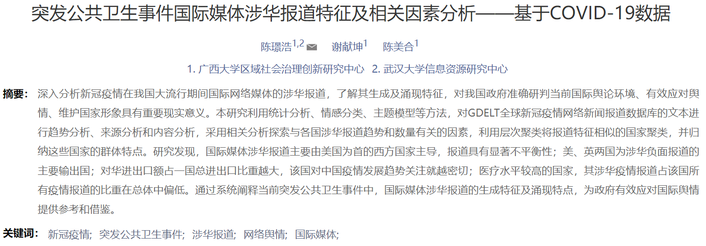 陈璟浩、谢献坤等在《信息资源管理学报》发文探讨国际媒体涉华报道的特征及因素