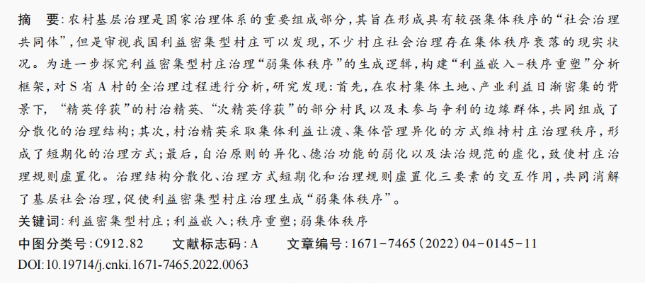 【引用格式】黄六招,姜修海,张国磊.利益密集型村庄治理“弱集体秩序”的生成逻辑——基于S省A村的调查与分析[J].南京农业大学学报(社会科学版),2022,22(04):145-155.