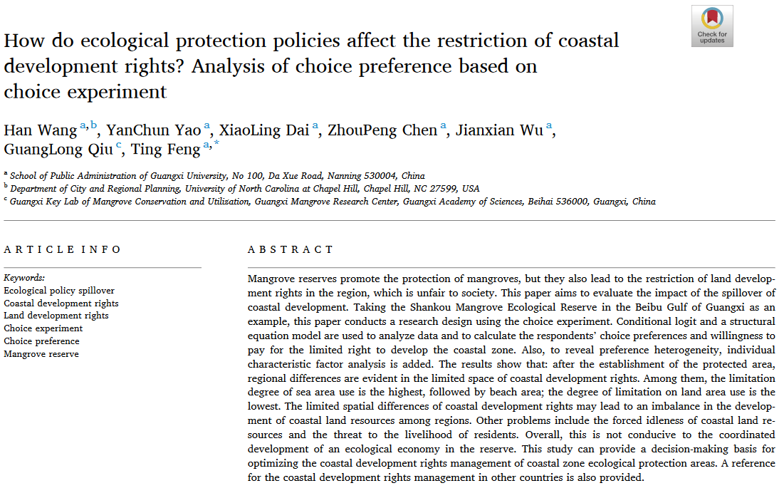 汪晗、奉婷等在Marine Policy发文检验生态保护政策如何影响沿海开发权的限制?基于选择实验的选择偏好分析