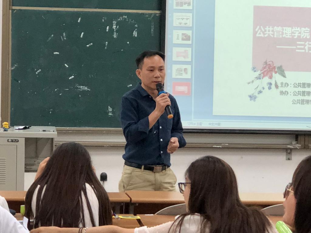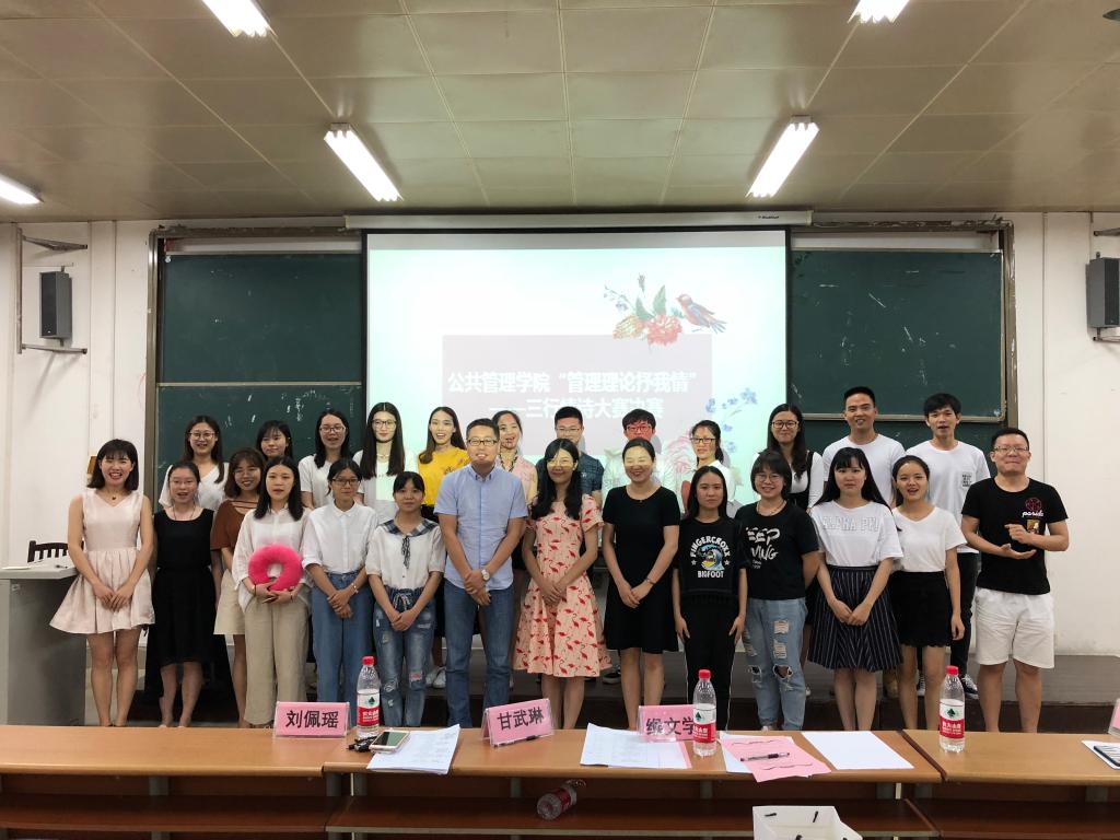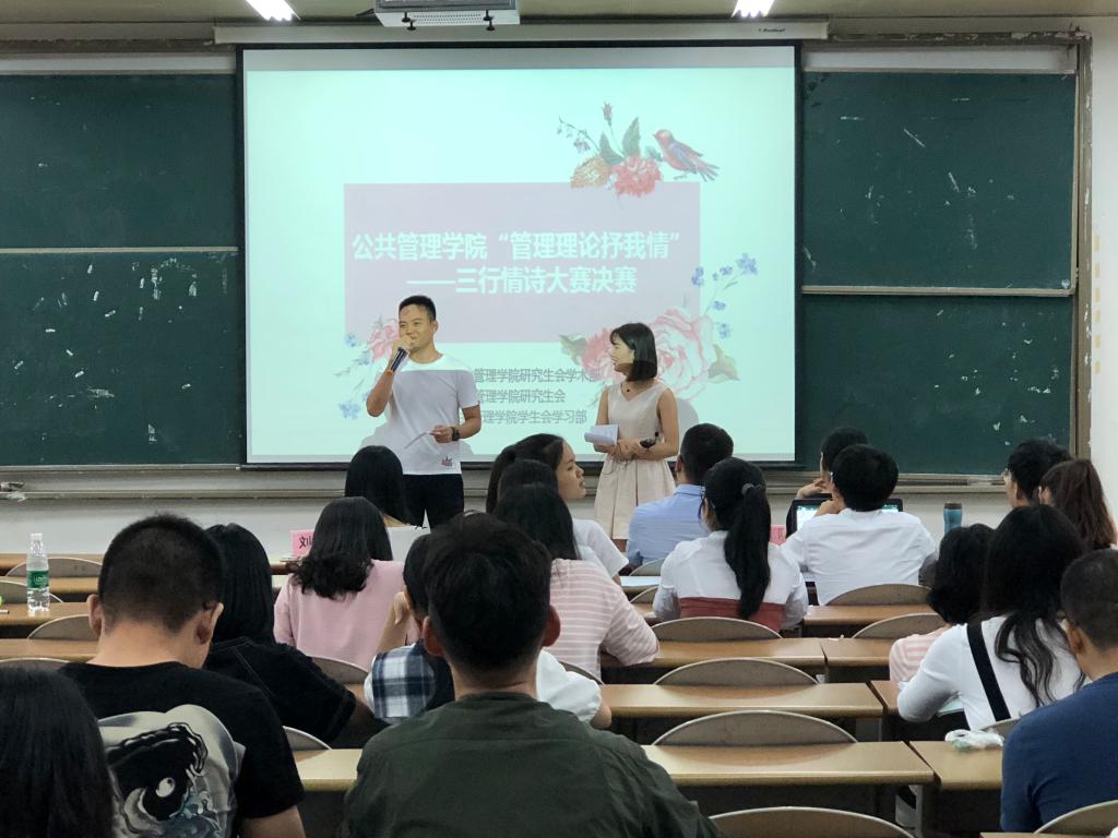 "管理理论抒我情"三行情诗大赛决赛。参与本次大赛的有评委甘武琳副书记、 社工系缑文学副主任、人教系陈曦萌老师、刘佩瑶老师,到场的还有18名决赛选手及各班派出的观赛同学。