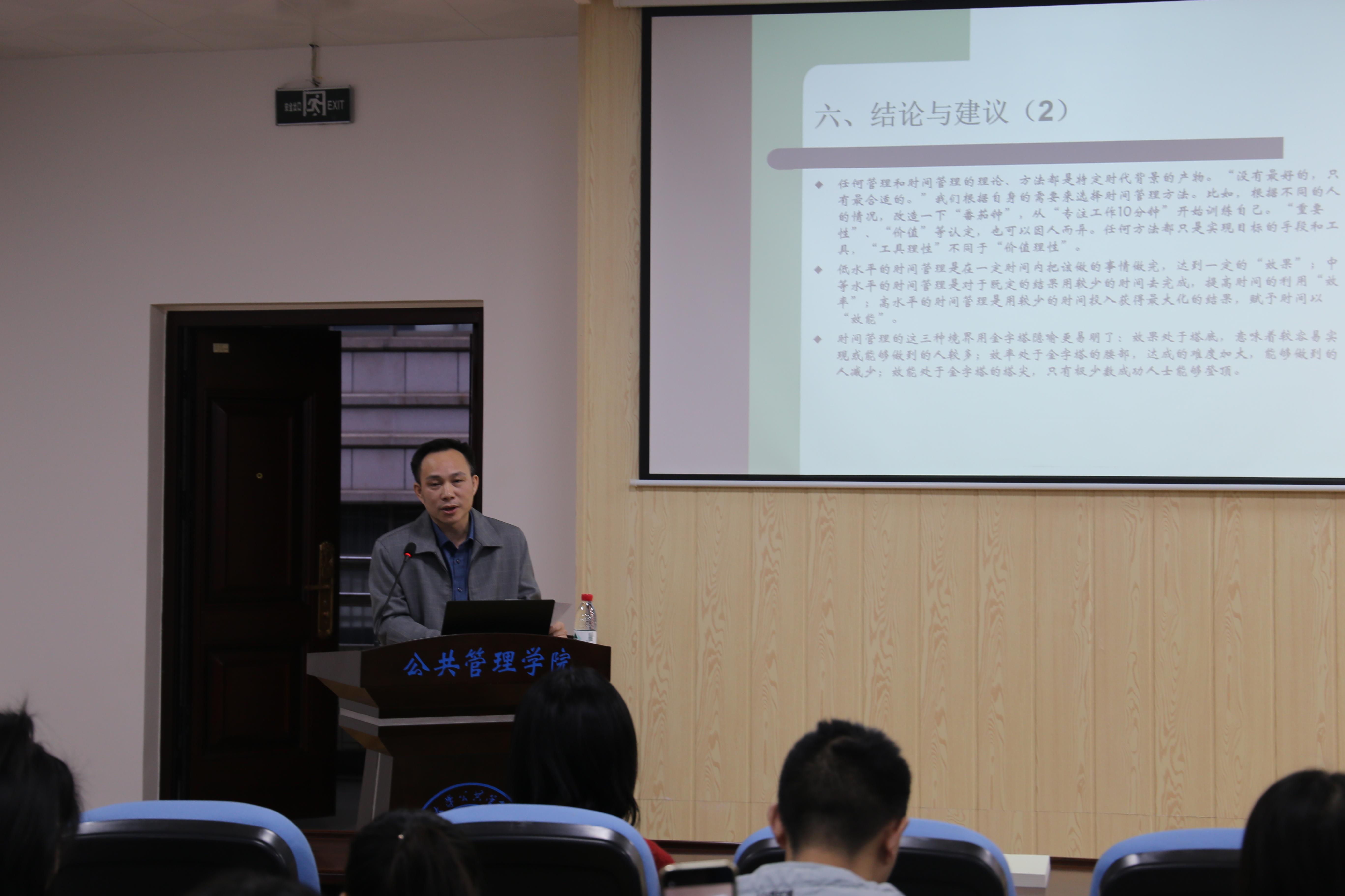 谢舜书记在课上运用时间的三重维度讲述时间管理如何影响行动的有效性,还在课上向大家推荐了时间管理的系列书单以及著名的时间管理方法,学生党员在课上认真记录笔记,课后均表示受益匪浅。