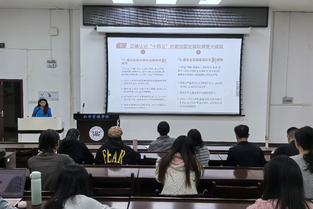 会议严格落实“第一议题”学习制度,由学生党建会副主任何诗怡带领全体成员深入学习党的二十届四中全会精神。重点解读了“十四五”时期我国发展的八大重大成就,阐释了“十五五”时期经济社会发展的指导思想、重大原则和战略任务,推动全会精神入脑入心。