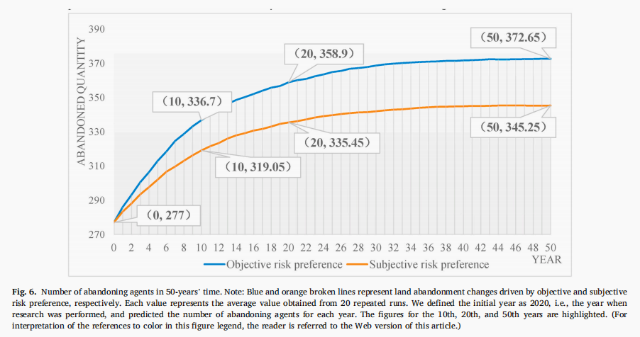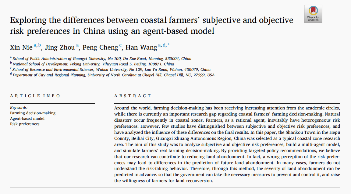 Nie X, Zhou J, Cheng P, et al. Exploring the differences between coastal farmers’ subjective and objective risk preferences in China using an agent-based model[J]. Journal of Rural Studies, 2021, 82: 417-429.